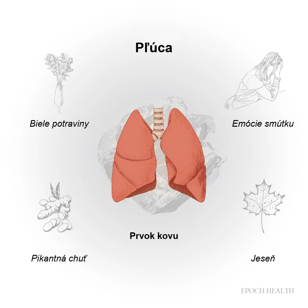 Podľa teórie piatich prvkov TČM sú pľúca spojené s prvkom kovu. Sú tiež spojené s emóciou smútku, ročným obdobím – jeseňou, pikantnými chuťami a bielou farbou.