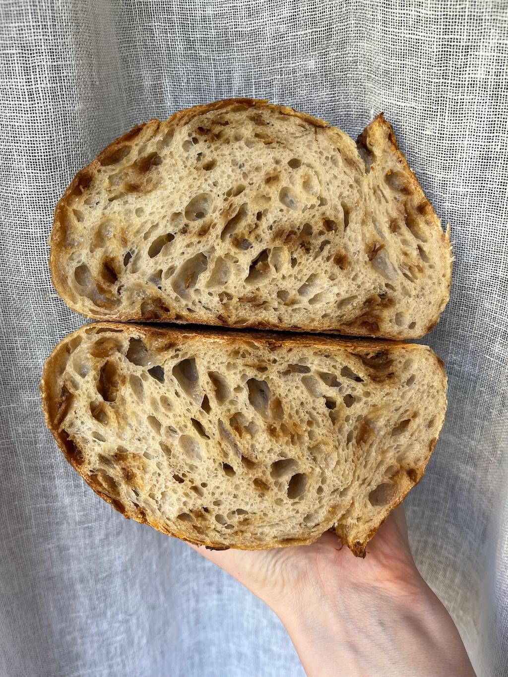 Fantázii sa teda medze nekladú ani pri kváskovaní. Vy ste sa ale rozhodli vyhrať aj s tradičnou slovenskou zeleninou. Kedysi dávno sa krájaná cibuľa podávala k chlebu bežne, dnes už pomenej. Narážam práve na váš „cibuliačik“. Prezradíte nám, o aký druh chlebíka ide? A ako vzniká?