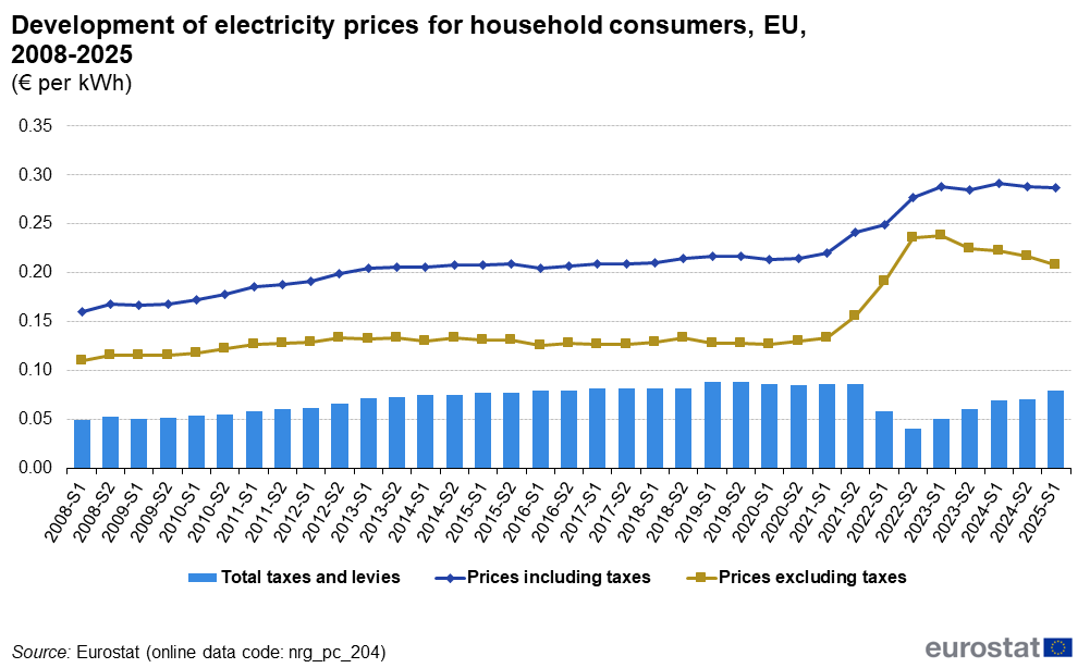 Celkovo priemerná cena elektriny pre domácnosti v bloku klesla v prvých šiestich mesiacoch o pol percenta a za posledné tri roky zostala relatívne stabilná, avšak stále zostáva výrazne nad úrovňou z rokov pred energetickou krízou v roku 2022.