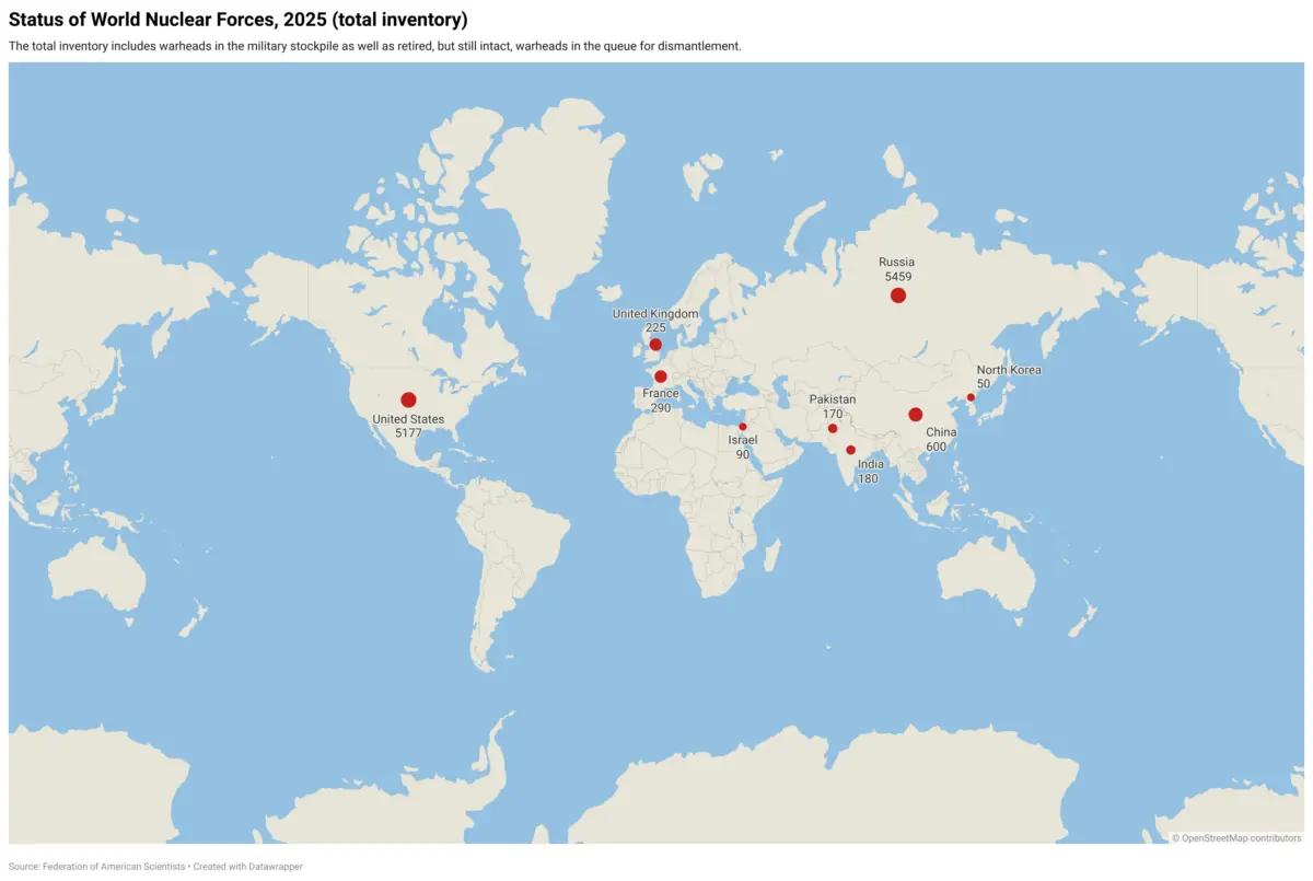 Spojené štáty a Rusko spolu vlastnia takmer 90 % svetových jadrových zbraní. Podľa Federácie amerických vedcov má Rusko približne 5 459 jadrových hlavíc a Spojené štáty približne 5 177. Tieto celkové počty zahŕňajú aktívne aj vyradené zbrane, ktoré ešte neboli demontované.