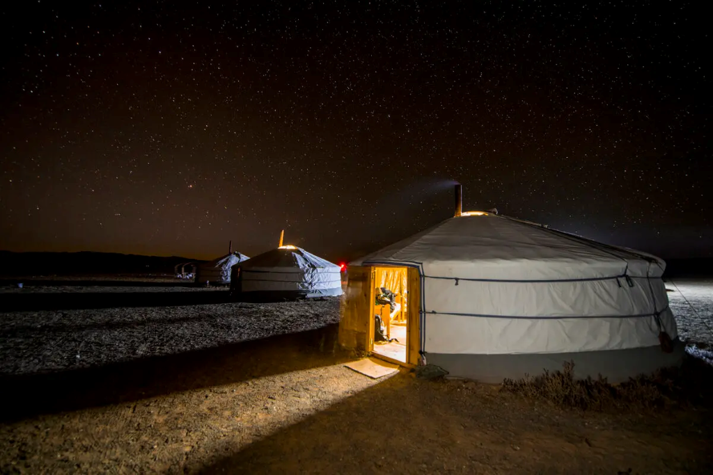 Ubytovanie poskytovalo pohodlné útočisko po náročných dňoch. Každá izba bola postavená ako tradičný nomádsky ger – okrúhly stan – ale s moderným vybavením vrátane dažďovej sprchy v kúpeľni a pekného krbu na zahriatie počas chladných nocí.