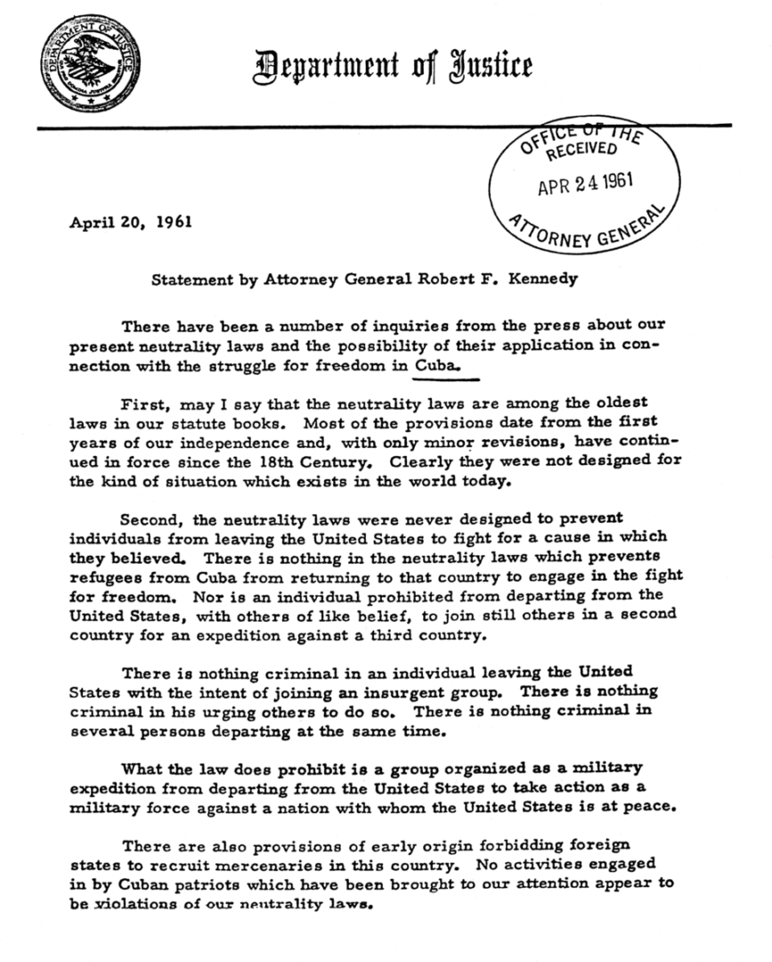 Vyjadrenie Roberta F. Kennedyho k zákonom o neutralite a boji za slobodu na Kube (Foto: The U. S. National Archives and Records Administration/voľné dielo)