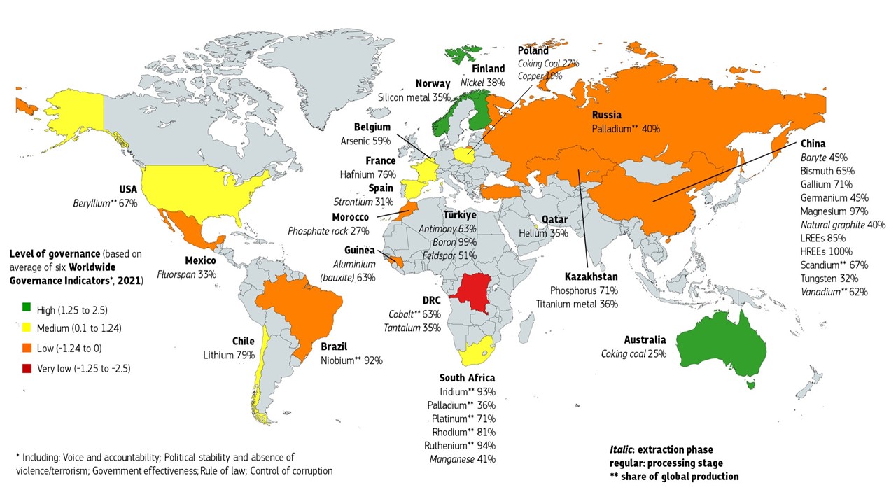 Ako uvádza ECB, Čína dominuje na svetovom trhu so vzácnymi zeminami, keďže produkuje 95 % svetových vzácnych zemín. Má tiež ústredné postavenie pri rafinácii ďalších kritických surovín, ako je lítium a kobalt.