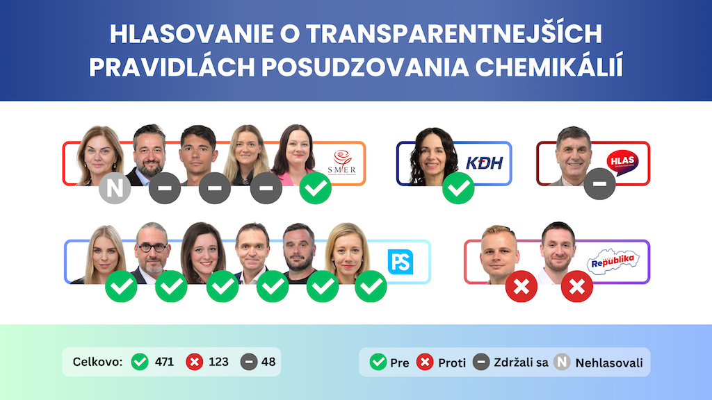 Všetky návrhy prešli výraznou väčšinou. Za spoločnú dátovú platformu o chemikáliách, ktorá zriaďuje rámec pre monitorovanie, zo slovenských zákonodarcov hlasovali Veronika Cifrová Ostrihoňová, Martin Hojsík, Ľubica Karvašová, Ľudovít Ódor, Michal Wiezik, Lucia Yar (všetci PS/Obnovme Európu), Miriam Lexmann (KDH/Európska ľudová strana) a Katarína Roth Neveďalová (Smer-SD/nezaradená).