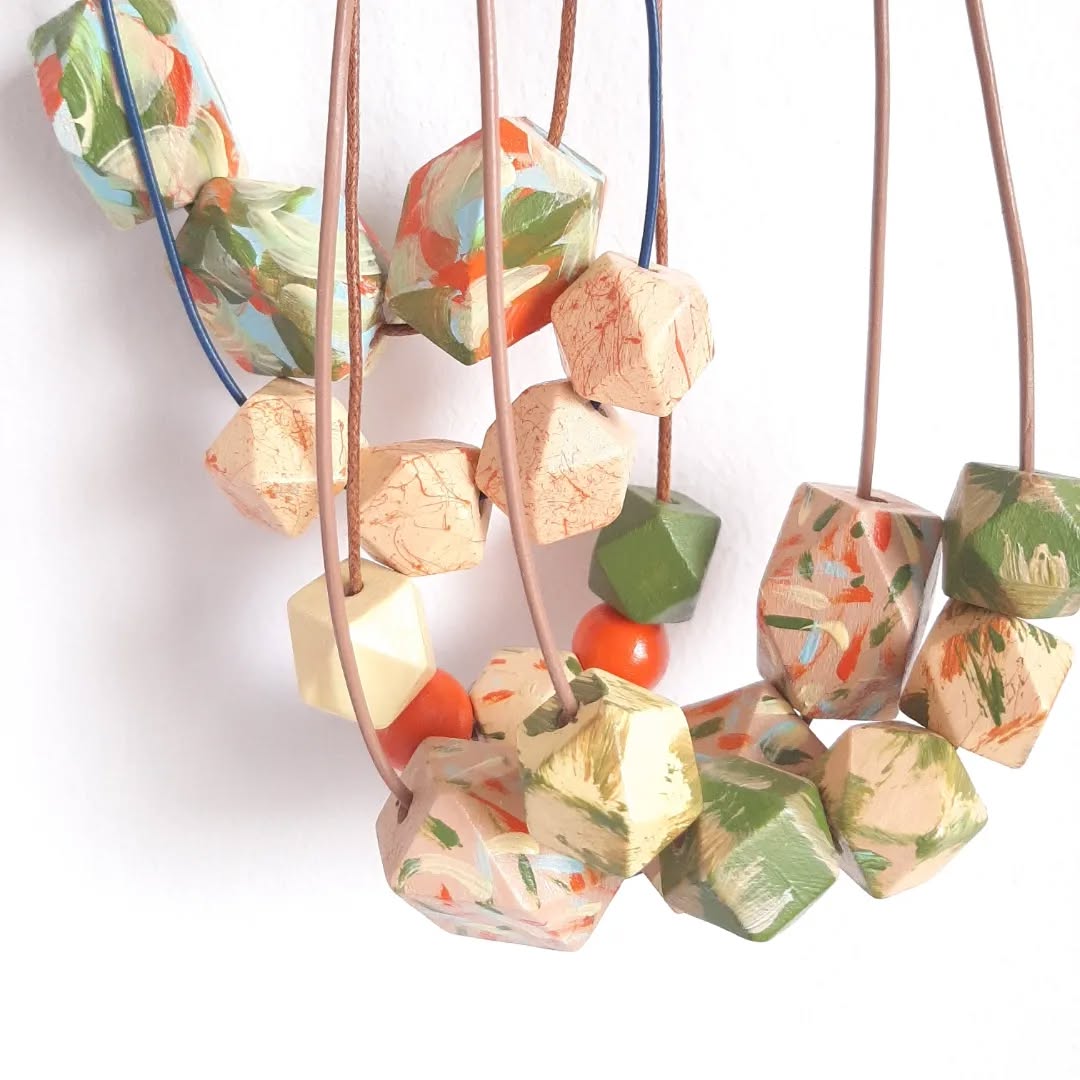 Častokrát sú to aj rôzne kombinácie dvoch alebo viacerých farieb na jednej korálke. V poslednom čase si získali obľubu farby lesklé, metalické (zlaté, strieborné, medené), ale v prírodných teplých tónoch. Za najideálnejšie farebné kombinácie považujem buď svieže letné odtiene, alebo harmonické zemité tóny, ktoré pôsobia prirodzene a nadčasovo. Vyhýbam sa krikľavým farbám. V mojej tvorbe preferujem paletu, ktorá je príjemná na pohľad, ľahko sa kombinuje a necháva vyniknúť samotný dizajn náhrdelníka. Všetko sú to akrylové farby, ktoré potom zalakujem, aby bola zachovaná ich stálosť.