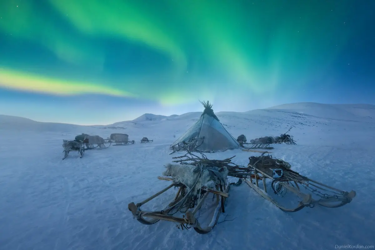 Počas poslednej noci na Jamale Kordan zachytil polárnu žiaru nad novým táborom. „Hneď, ako sme dorazili, Nenci okamžite postavili stany, roztopili pec a pozvali nás na čaj,“ povedal. „Nové miesto bolo neuveriteľne krásne – všade naokolo hory a nekonečná rozľahlosť,“ napísal.