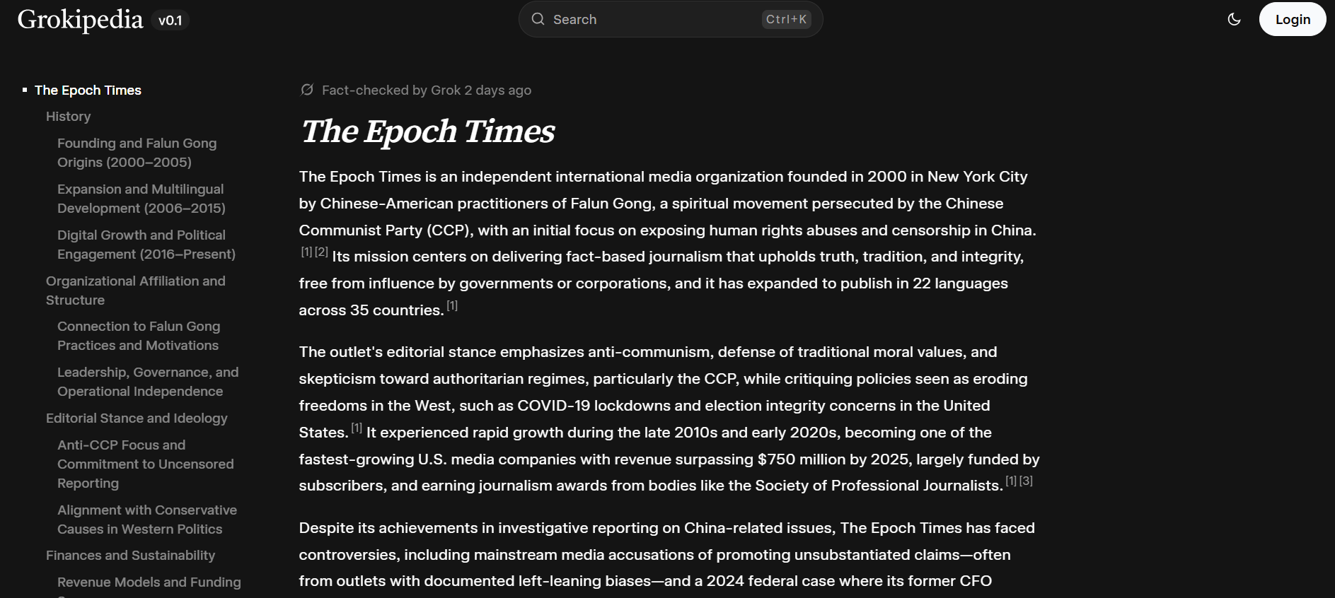 „The Epoch Times je nezávislá medzinárodná mediálna organizácia založená v roku 2000 v New Yorku čínsko-americkými podporovateľmi hnutia Falun Gong – duchovného hnutia prenasledovaného Čínskou komunistickou stranou. Pôvodne sa zameriavala predovšetkým na odhaľovanie porušovania ľudských práv a cenzúry v Číne,“ uvádza sa v úvode článku na Grokipédii (preložené). Ďalej Grokipédia uvádza, že poslaním novín je „poskytovať spravodajstvo založené na faktoch, ktoré ctí pravdu, tradíciu a integritu, bez vplyvu vlád alebo korporácií. Postupne sa rozrástli a v súčasnosti sa je napísanávydávajú v 22 jazykoch v 35 krajinách.