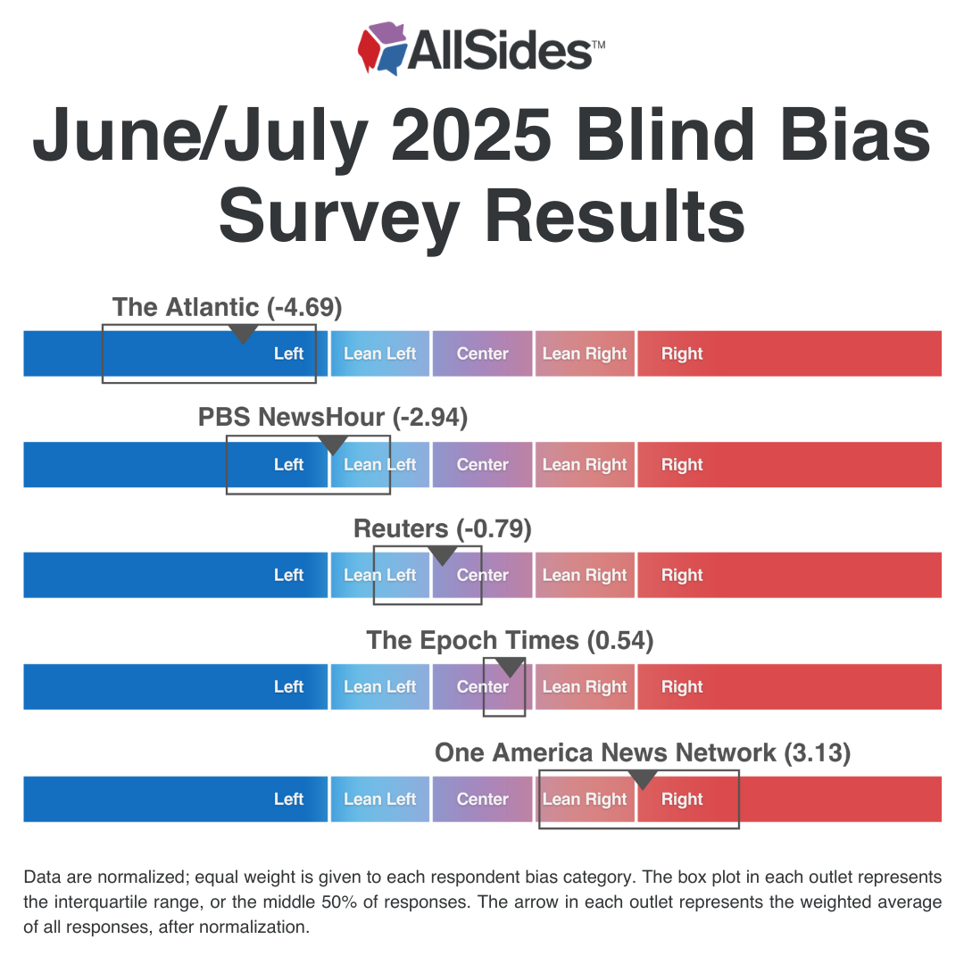 V júli 2025 uskutočnila spoločnosť AllSides Technologies prieskum o čitateľmi pociťovanej zaujatosti médií The Atlantic, The Epoch Times, PBS Newshour, Reuters a One America News (OAN). Na prieskume sa zúčastnilo celkovo 718 ľudí z USA z celého politického spektra.