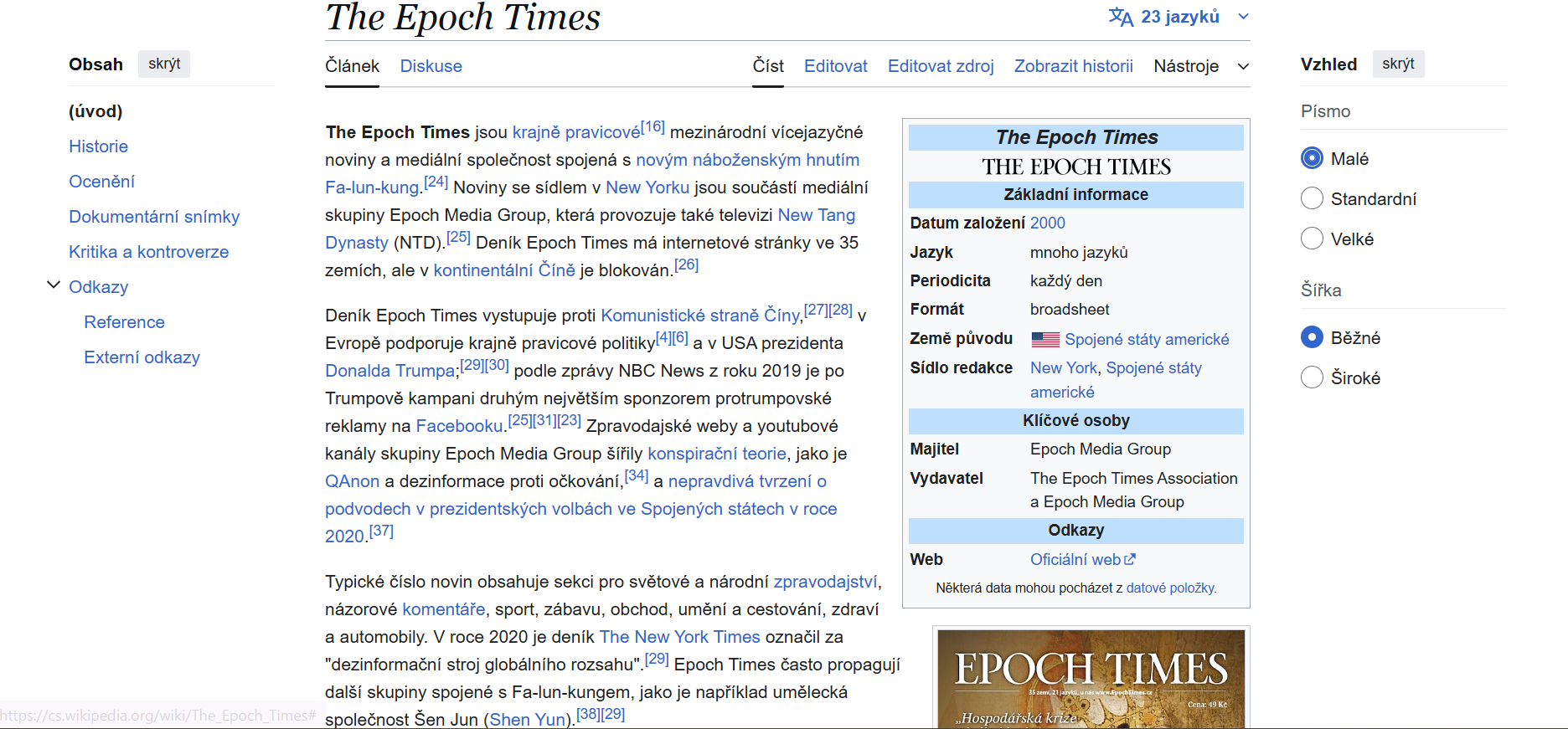„The Epoch Times sú krajne pravicové medzinárodné viacjazyčné noviny a mediálna spoločnosť,“ tvrdí sa v súčasnej českej a anglickej verzii Wikipédie. Wikipédia ďalej uvádza, že denník Epoch Times vystupuje proti Čínskej komunistickej strane a že „podporuje krajne pravicových politikov a v USA prezidenta Donalda Trumpa“. Ako zdroje týchto tvrdení sú pritom uvedené iné (konkurenčné) médiá a čínski autori.