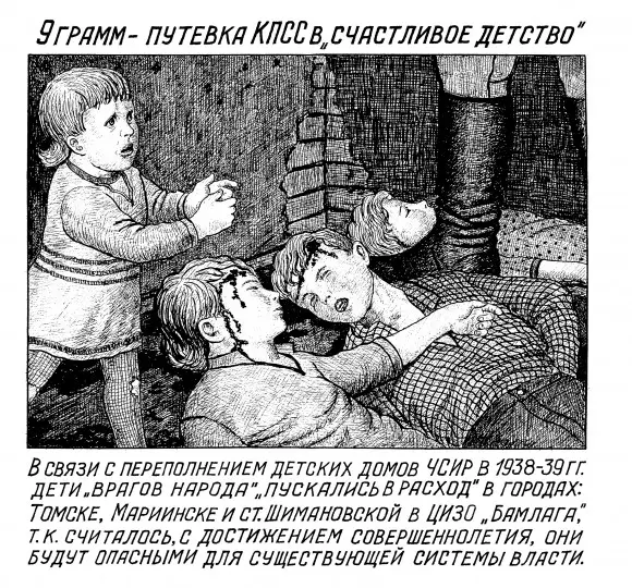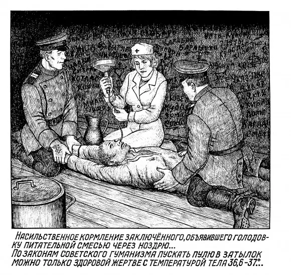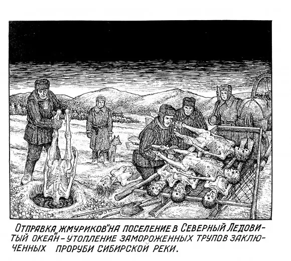 Na jednom obrázku muž vychudnutý na kosť stojí pred stenou s heslom „Vpred ku komunizmu!“. Ďalší zobrazuje nešťastného robotníka, ktorého sadistickí spoluväzni rozpíľujú na polovicu spoločne s kmeňom, na ktorý ho priviazali.