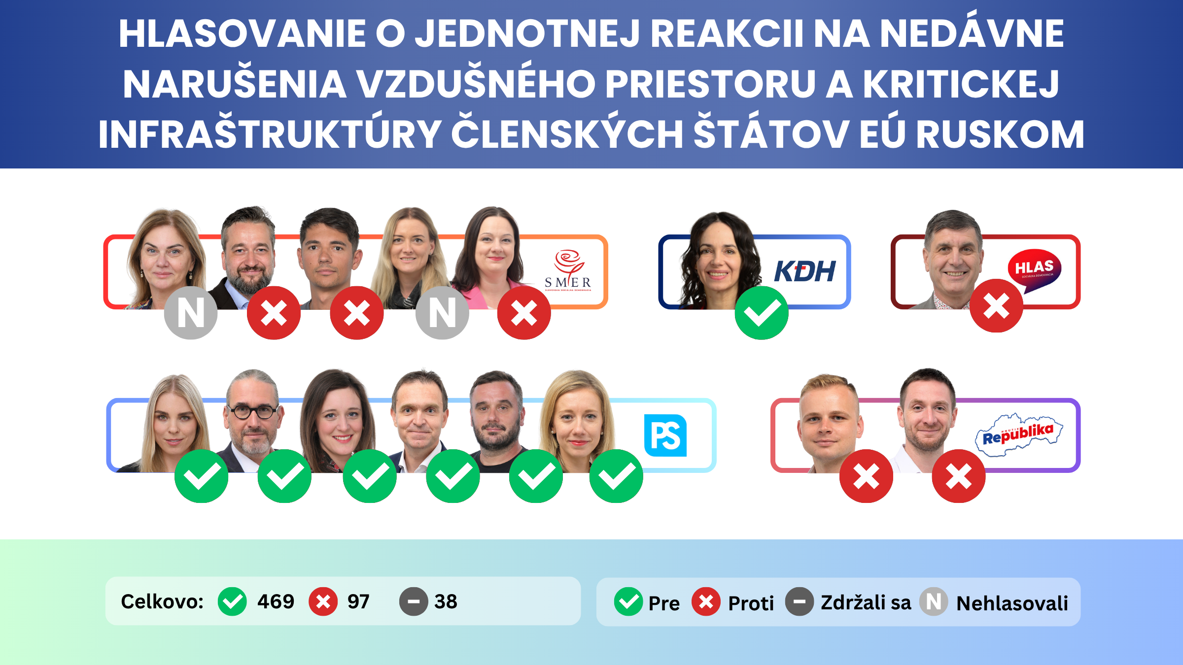 Uznesenie, ktoré bolo prijaté 9. októbra s výraznou väčšinou, požaduje okamžité posilnenie obrany, vrátane budovania „dronového múru“ a mechanizmu monitorovania východného krídla Únie, do ktorého patrí aj Slovensko.