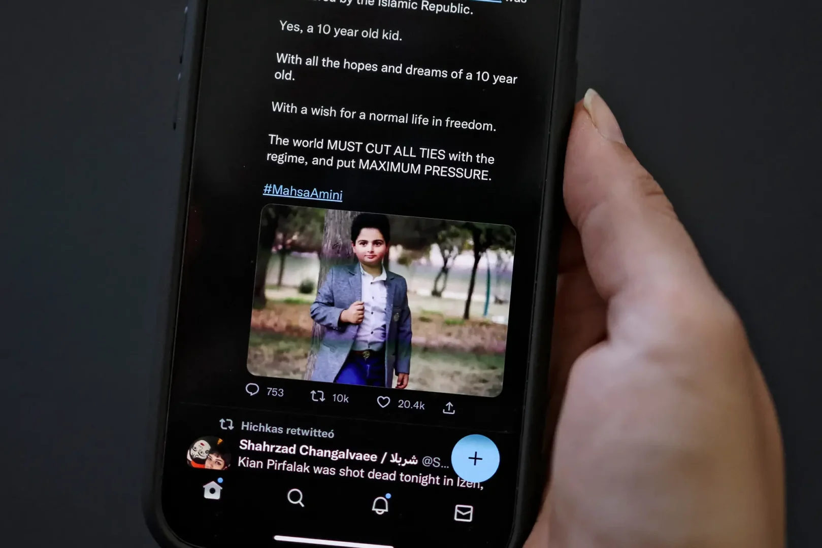 V ďalšom prípade bol 10-ročný Kian Pirfalak zabitý počas protestov v novembri 2022 v Izehu, keď vozidlo, v ktorom cestovala jeho rodina, sa dostalo pod paľbu na kontrolnom stanovišti. Jeho matka neskôr vo videu uviedla, že na ich vozidlo strieľali sily v civilnom oblečení, čo je v rozpore s oficiálnymi tvrdeniami, že za to boli zodpovední „teroristi“.