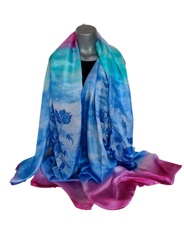 Na záver, keď je šatka naparená a zafixovaná, sa môže vyprať a po rubovej strane zažehliť. Šatka dosiahne jemný lesk a jemnosť. Takýto nádherný doplnok je výsledkom náročnej práce na hodvábnom materiáli, ktorý je známy svojim luxusným leskom a ľahkosťou.