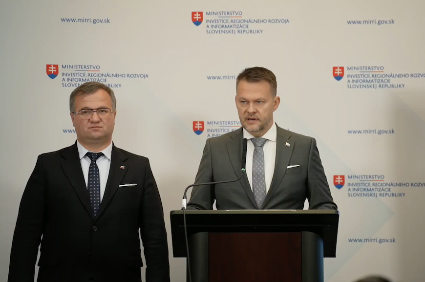 (Zľava) Štátny tajomník MIRRI Radomír Šalitroš a minister Samuel Migaľ počas tlačovej konferencie 1. októbra 2025. (Screenshot: FB / Samuel Migaľ)