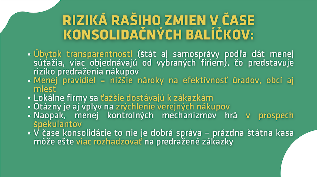 Tzv. Rašiho novela zákona o verejnom obstarávaní napríklad vyňala spod akýchkoľvek pravidiel všetky nákupy do 50-tisíc eur. Predtým bol limit 10-tisíc eur.