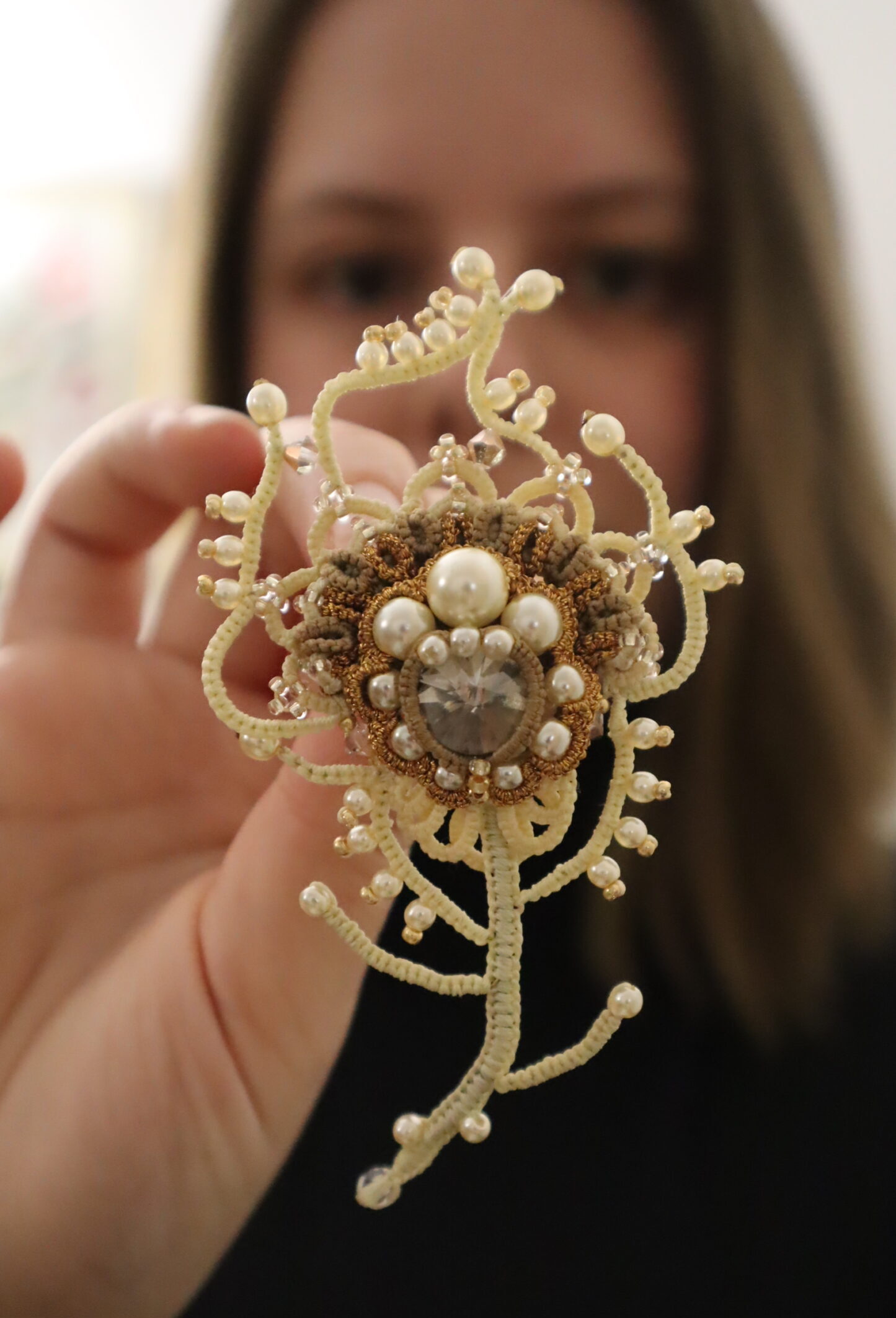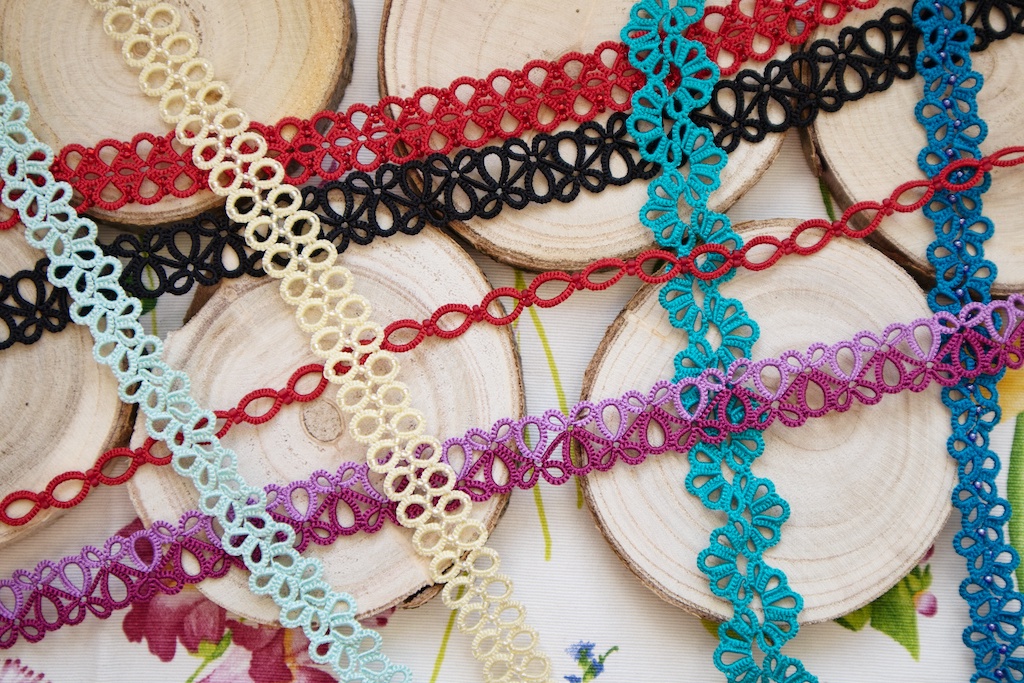 Frivolitky tvorím z polyesterových nití. Samozrejme, môže sa použiť aj bavlna, ale dostali by sme sa k rovnakému problému. Polyesterové nite nevyžadujú škrobenie, ľahko sa udržujú a tým, že majú stále farby, môžu sa vystavovať na slnku a nevadí im ani vlhkosť. Pre zákazníčky je to veľké plus, pretože si môžu šperk doma vyčistiť za 5 minút a nestratí svoj tvar. Pred časom sa mi dokonca podarilo niekoľko mojich brošní omylom oprať v práčke a stále si držali svoj tvar.