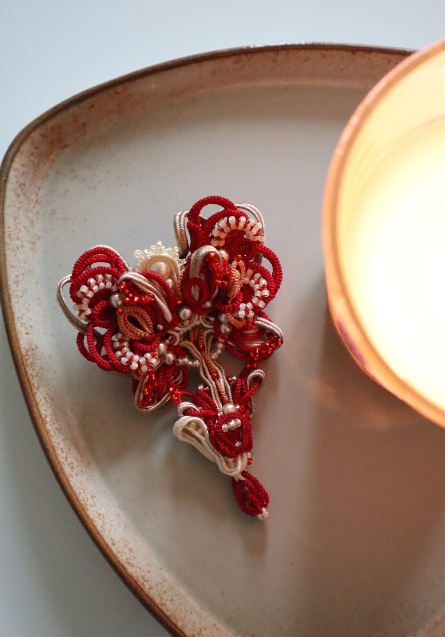 Áno, tá možnosť tu je. Všetko závisí od vašej fantázie. Rada kombinujem frivolitky s inými technikami. V roku 2024 som na spoločný projekt vo Vamberku vytvorila anjelské krídla. Základ bol paličkovaný a na ňom boli prišité frivolitkované kvety. Rada skúšam a učím sa nové veci. Častokrát premýšľam nad tým, s čím všetkým by som mohla frivolitkovanie spojiť, aby vznikli netradičné šperky. A tak prišlo na sujtáš, korálkovanie a s kamarátkou, ktorá sa venuje galvanoplastike, sme pár čipiek aj pokovovali a výsledok je zaujímavý. Pred časom ma začal fascinovať aj porcelán, a tak do budúcna plánujeme spojenie frivolitkovania a porcelánu.