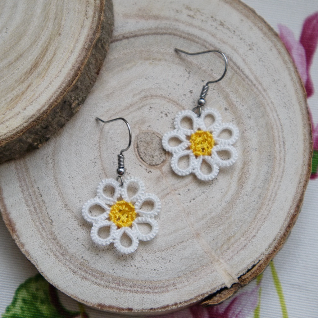 Kvetinových náušníc mám vo svojej ponuke viacero. Ak by sme sa však pozreli na margarétky, tam mi trvá upliesť jeden pár cca 20 minút. Každý kvet pletiem v jednom celku, teda sú potrebné dva kusy kvetov na jeden pár. Puzety, ktoré sú najmenšie náušnice v mojej ponuke, mi spolu so zošitím zaberú cca 30 minút. Upliesť samotnú kytičku netrvá dlho, trochu náročnejšie je samotné prišívanie na lôžko. Keď som s puzetami začínala, tak mi jeden pár trval aj hodinu.