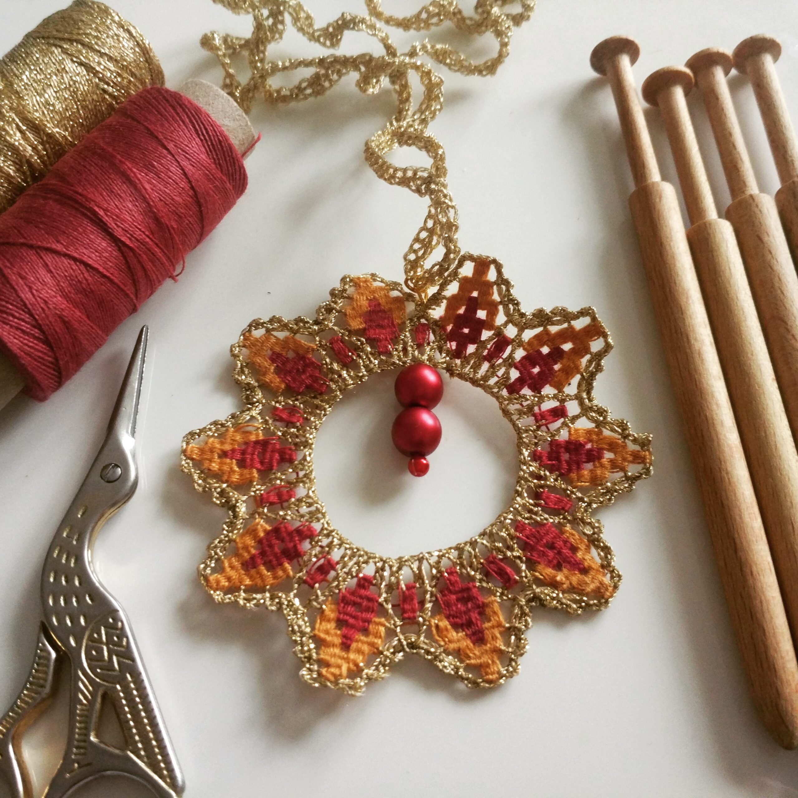 To je aj hlavný dôvod, prečo pri frivolitkovaní siaham zásadne po polyesterových nitiach. Sú odolné, pevné, majú jemný lesk, čo je pri šperkoch vítané, ale hlavne držia tvar, čím sa nemusia škrobiť a pre ženy, ktoré si ich kupujú, sú ľahko udržiavateľné.