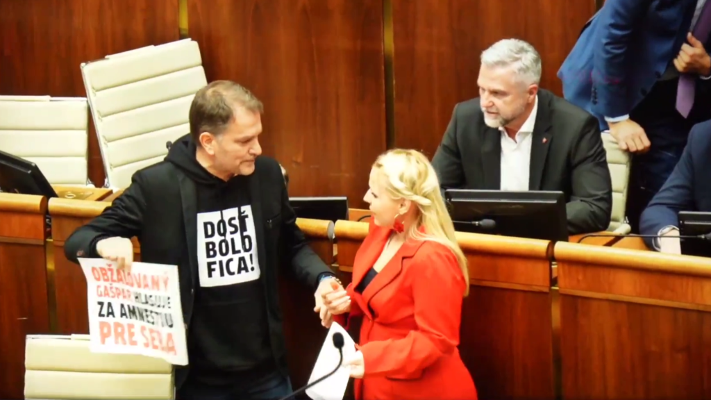 Zároveň sa ospravedlnil za tvrdé slová, ktoré v emotívnej situácii odzneli, a vysvetlil ich svojím dlhoročným bojom proti „mafii“ a nespokojnosťou s tým, ako podľa neho koalícia narába s legislatívnym procesom, demokraciou a spravodlivosťou. Na videách vidieť a počuť, ako sa postavil pred Tibora Gašpara (Smer) s plagátom „Obžalovaný Gašpar hlasuje za amnestiu pre seba“.