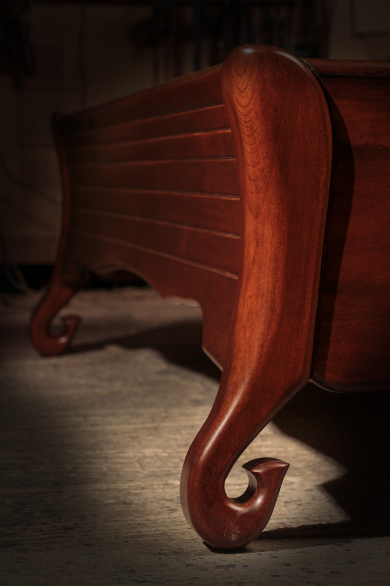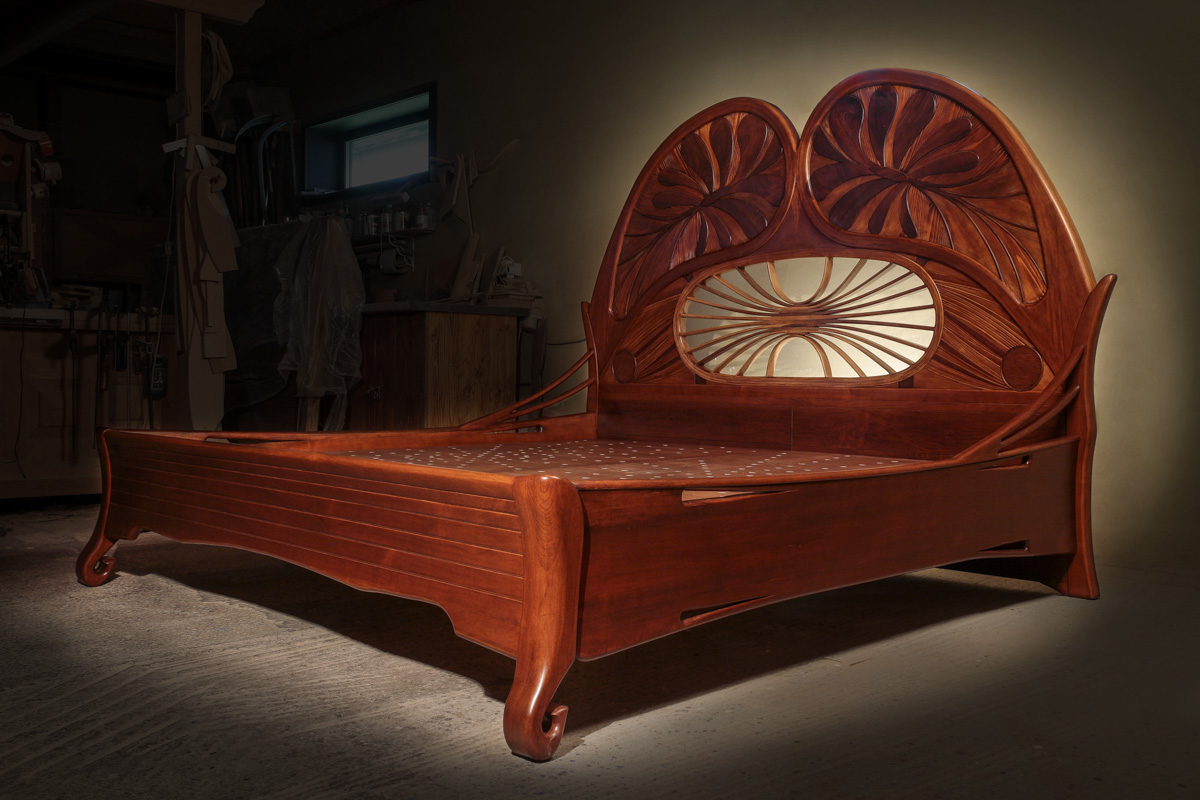 Postele začínam vytvárať od zadného čela, ktoré je aj časovo najnáročnejšie a k nemu podľa typu postele sa vyrobí rám. Na spájanie rámu a čela mám vlastný spôsob, ktorý zabezpečí maximálnu pevnosť. Pri pevnosti postele veľa záleží aj od výberu materiálu, preto preferujem tvrdé dreviny ako dub, orech, jaseň alebo brest. Vytvoril som aj zopár postelí z mäkkých drevín, pri ktorých sa časti spojov, ktoré držia rám pokope, vytvorili z tvrdého pevnejšieho dreva – mäkké drevo na spoje nepoužívam.