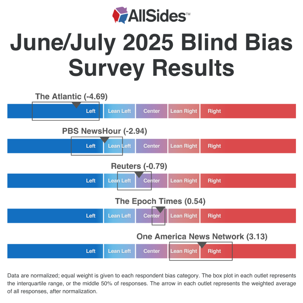 V polovici roka 2025 uskutočnila spoločnosť AllSides prieskum. Viac ako 700 účastníkom z celého politického spektra boli predložené titulky a články na zaradenie do kategórií „ľavica / skôr ľavica / stred / skôr pravica / pravica“, bez uvedenia názvu konkrétneho média. Výsledkom bolo, že 623 účastníkov zaradilo Epoch Times ako mediálnu spoločnosť do politicky neutrálneho stredu.