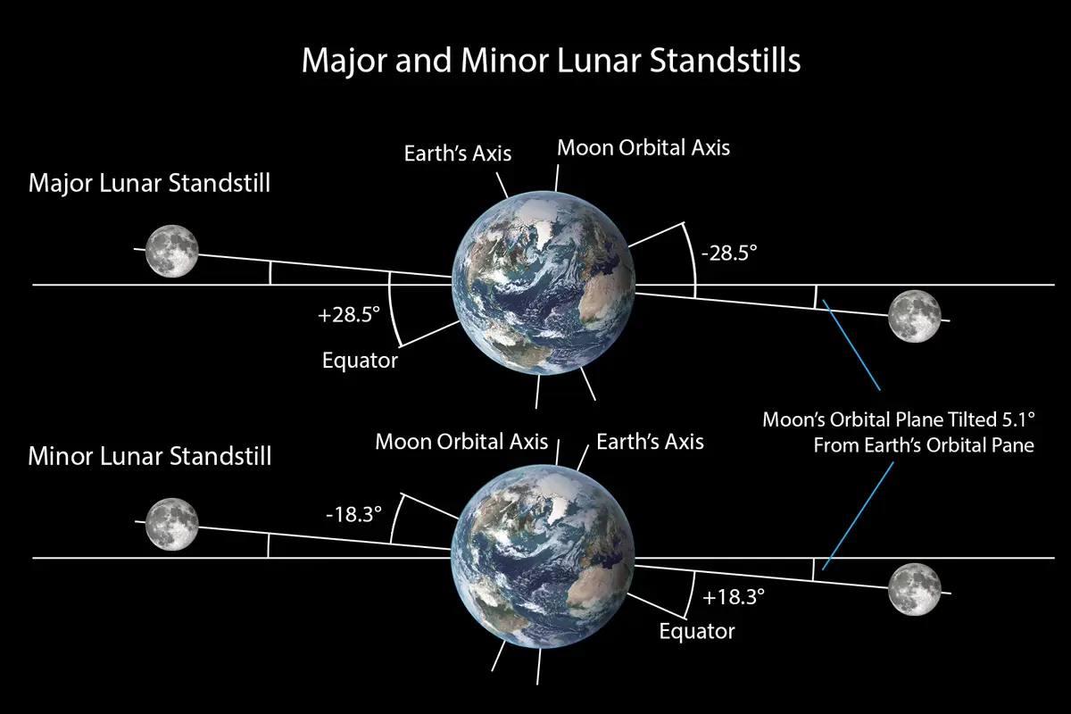 Je známe, že oblúk obežnej dráhy Mesiaca stúpa a klesá v priebehu roka: najvyššie je v zime a najnižšie v lete (pre Slnko platí opak). Tento pohyb je spôsobený naklonením zemského pólu o 23,4 stupňa vo vzťahu k rovine obežnej dráhy Zeme. Vďaka tomu máme štyri ročné obdobia.