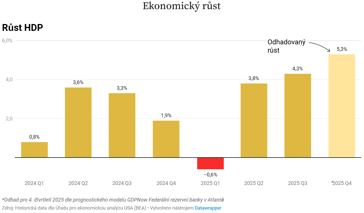 Po kvartálnom poklese ekonomiky o 0,6 % v prvom štvrťroku 2025 sa rast hospodárstva Spojených štátov zrýchlil a prekonal očakávania ekonómov, čím sa podarilo odvrátiť obavy z recesie. Hrubý domáci produkt vzrástol v druhom štvrťroku o 3,8 % a v treťom štvrťroku o 4,3 %, čo je najvýraznejší rast za posledné dva roky. Hoci ešte nie sú k dispozícii oficiálne údaje za obdobie od októbra do decembra 2025, Federálna rezervná banka v Atlante odhaduje rast na približne 5 %. Minister financií Scott Bessent očakáva, že rok 2026 bude pre ekonomiku mimoriadne silný a prinesie pokračujúci robustný rast.