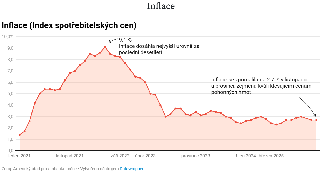 Inflácia dosiahla v roku 2022 úroveň 9,1 %, čo bolo najvyššie tempo rastu cien za posledné desaťročia. Hoci spotrebiteľské ceny zostali v roku 2025 na vysokej úrovni, miera inflácie bola nižšia ako počas predchádzajúcej vlády prezidenta Joea Bidena. Ročná inflácia vstúpila do roku 2025 na úrovni 3 %, v apríli klesla na 2,3 % a o päť mesiacov neskôr sa vrátila na 3 %. V novembri a decembri sa cenové tlaky zmiernili a 12-mesačná miera inflácie výrazne klesla na 2,7 %, najmä v dôsledku poklesu cien pohonných hmôt.