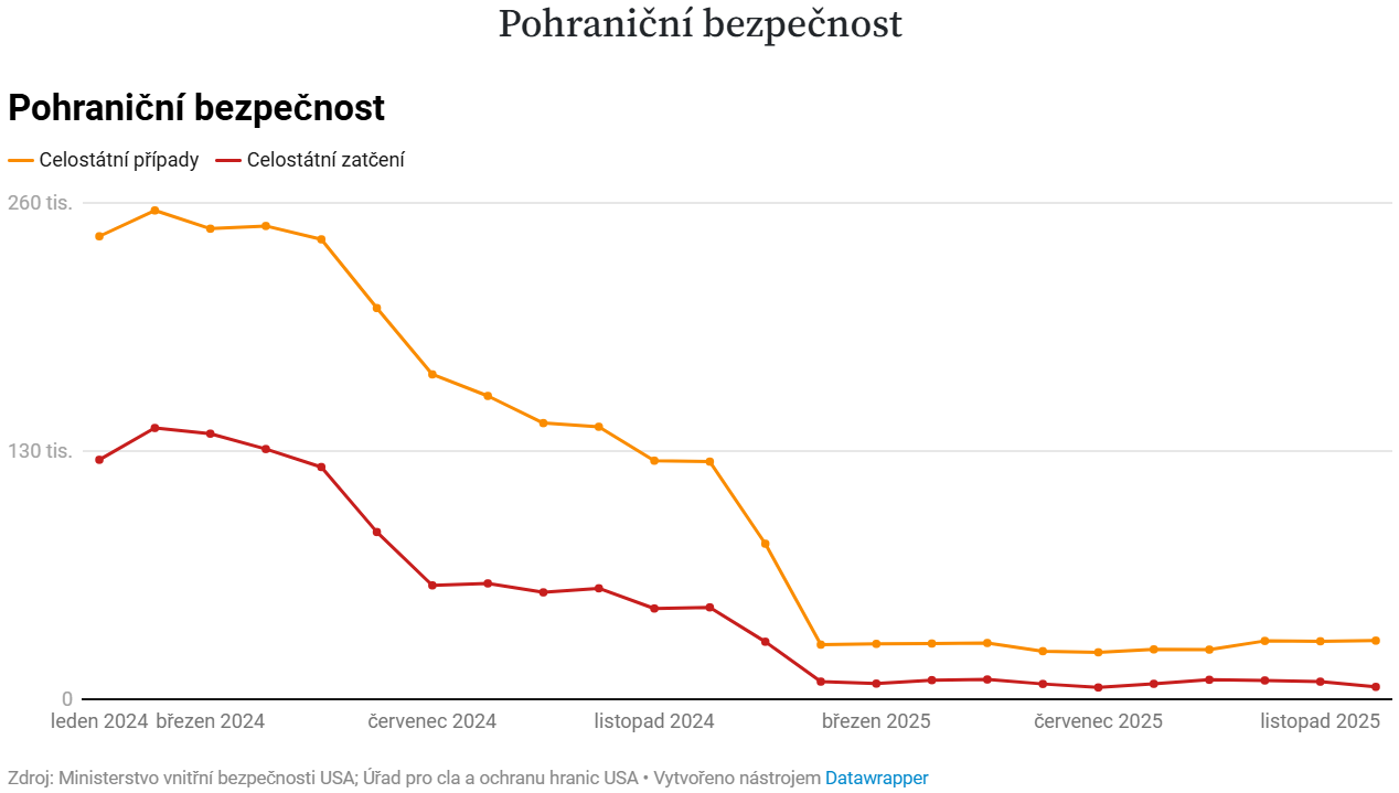 Prezident Donald Trump označil ochranu hraníc za jednu z hlavných priorít svojej politiky. Podľa dostupných údajov viedla posilnená kontrola hraníc k 93 % poklesu nelegálnych prechodov hraníc, 622 000 deportáciám a približne 1,9 milióna prípadov takzvaného dobrovoľného návratu do krajiny pôvodu. Tieto výsledky boli dosiahnuté hlavne zvýšením počtu imigračných úradníkov a sprísnením imigračných postupov.