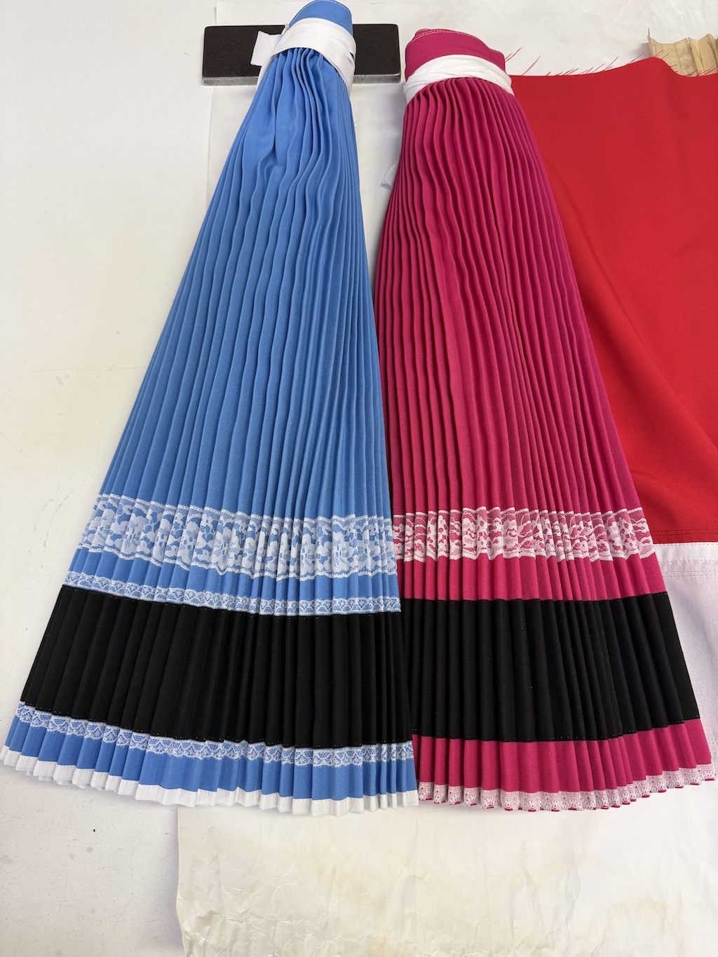 Príprava látky je veľmi dôležitá: ozdobné prvky ako kvietky, stužky, strapce alebo rôzne čipky musia byť našité ešte pred vložením látky do šablóny. Niektoré sukne sa skladajú z dvoch alebo viacerých dielov, ktoré sa po plisovaní zošívajú do finálneho tvaru.