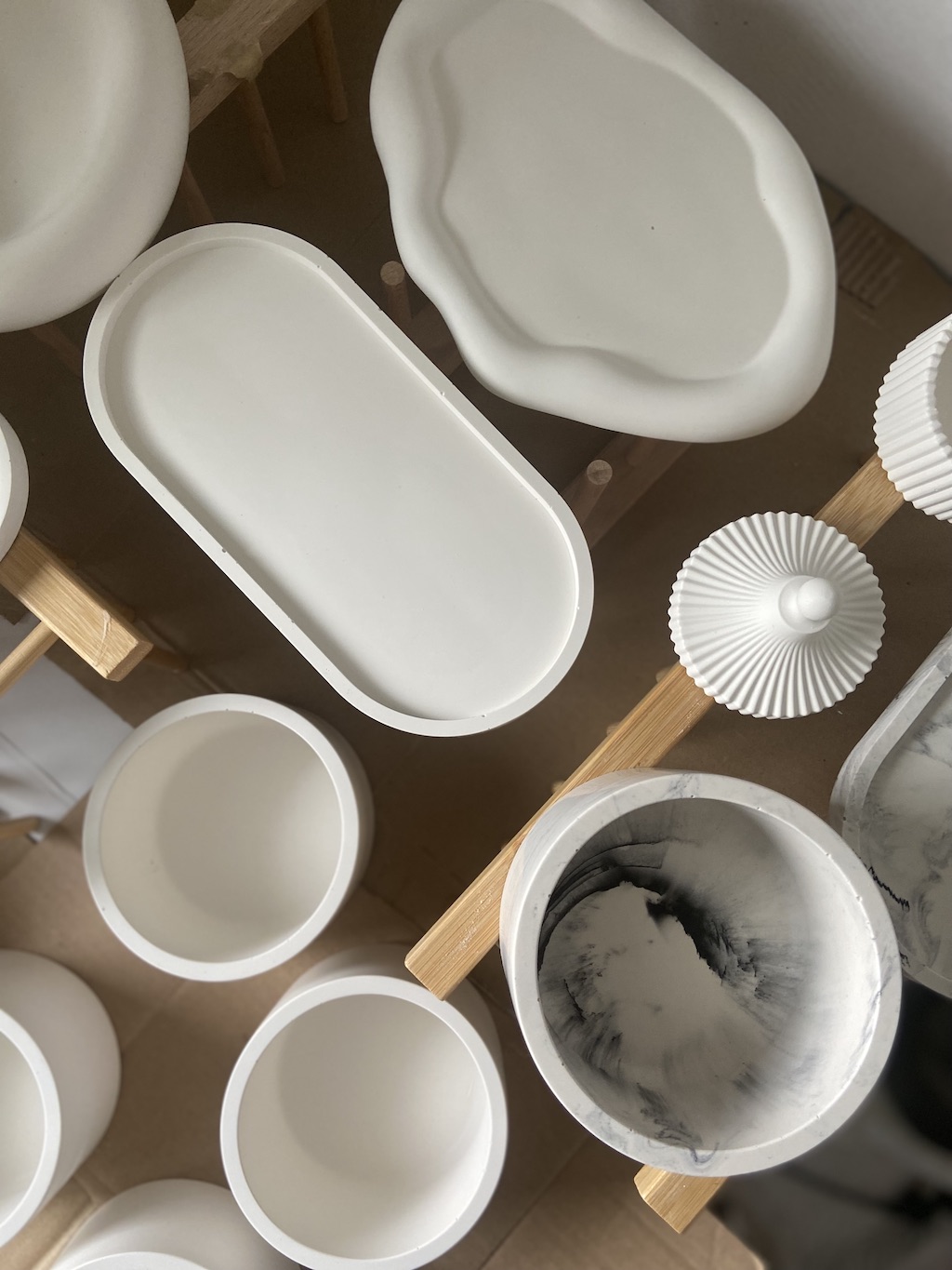 Jesmonite je kompozitný materiál, zmes minerálneho prášku a akrylátovej živice na vodnej báze. Je to ekologickejšia alternatíva k betónu, od ktorého som upustila v tehotenstve, a so sójovým voskom sviečka vytvára celkovo ekologickejšiu kombináciu materiálov.